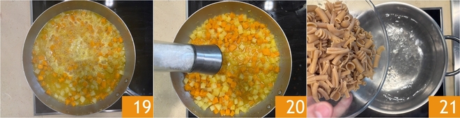 Faites cuire pendant 10 minutes à feu moyen 19, puis salez 20. Faites cuire les pâtes intégrales mélangées dans de l'eau bouillante légèrement salée 21.