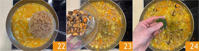 Égouttez les pâtes à mi-cuisson 22 et versez-les dans la poêle avec le condiment, puis portez-les à cuisson. Enfin, ajoutez les moules 23 et le persil 24.