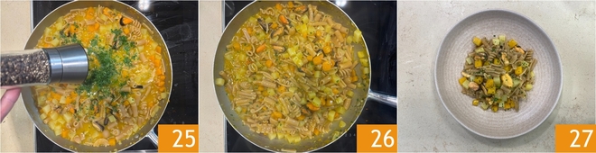 Poivrez 25 et mélangez avec l'huile d'olive extra vierge, puis donnez un dernier mélange 26. Servez immédiatement vos pâtes avec courge, pommes de terre et moules 27 !
