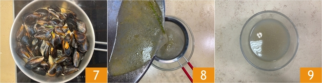 Une fois ouvertes 7, égouttez les moules 8 et conservez leur eau de cuisson 9.