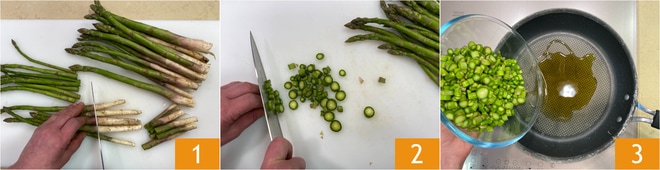 Pour préparer les pâtes à la crème d'asperges, stracciatella et poutargue, commencez par Comment nettoyer les asperges : éliminez les extrémités les plus dures 1, puis coupez-les en rondelles régulières 2 en réservant les pointes. Dans une poêle, faites chauffer un filet d'huile, puis ajoutez les asperges 3.