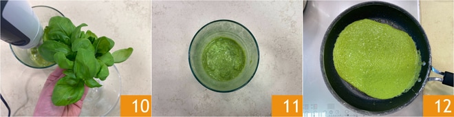 Ajoutez également les feuilles de basilic lavées et séchées 10, un filet d'huile d'olive et mixez le tout avec un mixeur plongeant jusqu'à obtenir une crème lisse et sans grumeaux 11. Versez la crème obtenue dans la même poêle utilisée pour cuire les asperges 12.