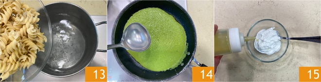 En attendant, faites cuire les fusilloni dans de l'eau bouillante salée pour deux tiers du temps indiqué sur l'emballage 13. Versez une louche d'eau de cuisson des pâtes dans la poêle avec la crème d'asperges 14 et laissez sur feu très doux pendant que vous continuez la préparation. Versez dans un bol la stracciatella et assaisonnez-la avec un filet d'huile 15.