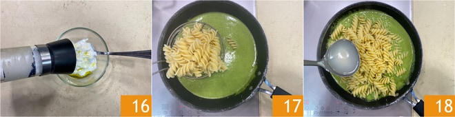 Assaisonnez avec une pincée de sel 16 et mélangez. Égouttez les fusilloni dans la poêle 17 et terminez la cuisson en ajoutant peu à peu l'eau des pâtes 18.