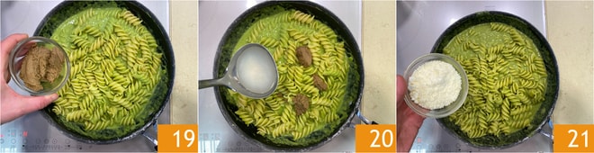 Ajoutez également le pâté d'olives 19 et une autre louche d'eau chaude 20. Une fois les pâtes prêtes, éteignez le feu et ajoutez le Parmigiano Reggiano AOP râpé 21.