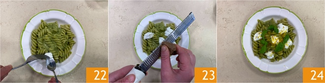 Servez dans les assiettes, en garnissant avec des morceaux de stracciatella 22 et de la poutargue râpée à votre goût 23. Les pâtes à la crème d'asperges, stracciatella et poutargue sont prêtes à être servies 24 !