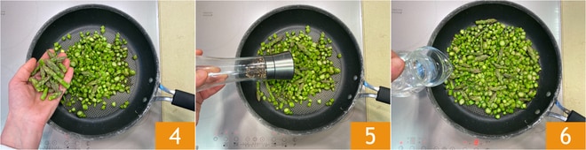 Ajoutez également les pointes 4, puis salez, poivrez à votre goût 5 et mouillez avec un peu d'eau 6.