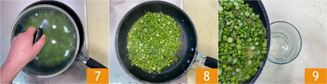 Couvrez avec un couvercle 7 et laissez mijoter les asperges pendant quelques minutes, juste le temps de les ramollir 8. Transférez les asperges dans un récipient haut, avec leur eau de cuisson 9.