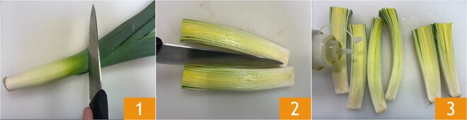 Pour préparer les pâtes à la crème de poireaux braisés, noisettes et fenouil, commencez par nettoyer les poireaux : enlevez la partie verte 1 et la base, puis divisez-les en deux dans le sens de la longueur 2 et assaisonnez avec de l'huile 3.
