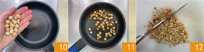 En attendant, versez les noisettes dans une poêle déjà chaude 10 et faites-les griller pendant quelques minutes, en veillant à ne pas les brûler 11. Hachez grossièrement les noisettes au couteau 12.