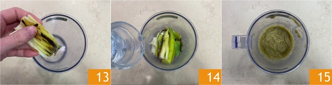 Reprenez les poireaux braisés et mettez-les dans un récipient 10, puis ajoutez très peu d'eau 11 et mixez avec un mixeur plongeant jusqu'à obtenir une crème lisse et homogène 12. Mettez de côté.