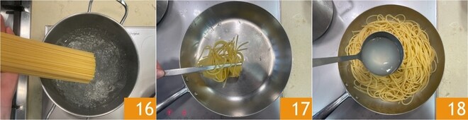 Faites cuire les spaghetti dans une grande quantité d'eau bouillante salée 16. Égouttez les pâtes 2 minutes avant la fin de la cuisson et transférez-les dans une poêle 17, puis ajoutez une louche de l'eau de cuisson 18.