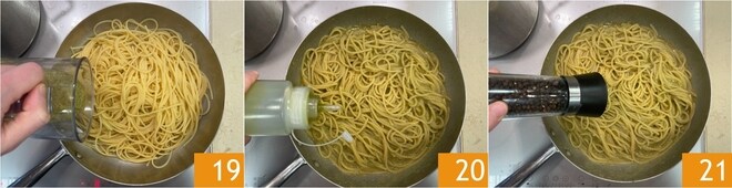 Ajoutez la crème de poireaux 19 et terminez la cuisson. Éteignez le feu, versez un filet d'huile 20, poivrez 21 et mélangez.