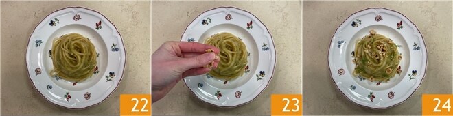 Disposez les spaghetti dans les assiettes 22, puis complétez avec les noisettes hachées 23 et le fenouil sauvage. Les pâtes à la crème de poireaux braisés, noisettes et fenouil sont prêtes à être servies 24 !
