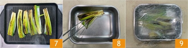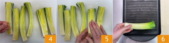 Laissez bien griller les poireaux des deux côtés 7, cela prendra environ 10 minutes. Lorsqu'ils seront ramollis, transférez-les dans un plat 8, couvrez avec du film plastique et laissez-les reposer pendant 10 minutes 9; ainsi, ils continueront à ramollir grâce à leur propre vapeur.