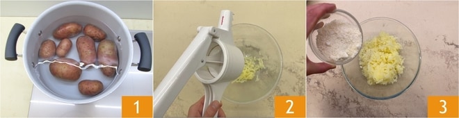 Pour préparer les pâtes à la crème de pommes de terre et saucisse, commencez par faire bouillir les pommes de terre entières pendant environ 40 minutes 1, ou jusqu'à ce qu'elles soient tendres. Avec un presse-purée, réduisez-les en purée 2, puis ajoutez à cette purée le Parmigiano Reggiano DOP râpé 3.