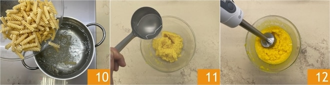 En attendant, faites cuire les pâtes pendant le temps indiqué sur l'emballage 10. Pendant qu'elles cuisent, assouplissez le mélange de pommes de terre et safran avec de l'eau de cuisson 11, puis mixez avec un mixeur plongeant 12.