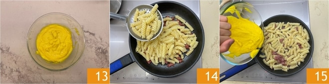 Vous devez obtenir une crème lisse et assez fluide 13. Égouttez les pâtes dans la poêle avec la saucisse 14, ajoutez la crème de pommes de terre 15.