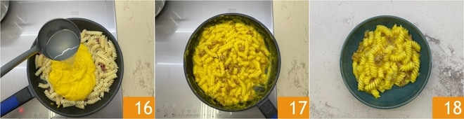 Ajoutez également une louche d'eau de cuisson 16, ou juste assez pour lier et amalgamer la sauce 17. Les pâtes à la crème de pommes de terre et saucisse sont prêtes à être dégustées 18 !