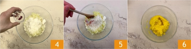 Ajoutez le safran en poudre 4, du sel et du poivre. Mélangez 5 pour obtenir un mélange assez épais et homogène 6.
