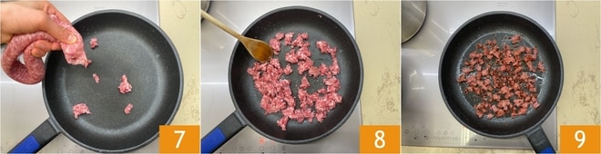 Retirez la saucisse de son boyau, émiettez-la et mettez-la dans une poêle légèrement chauffée (sans ajout de matières grasses) 7. Faites-la rissoler pendant quelques minutes en remuant souvent 8 jusqu'à ce qu'elle devienne dorée 9.