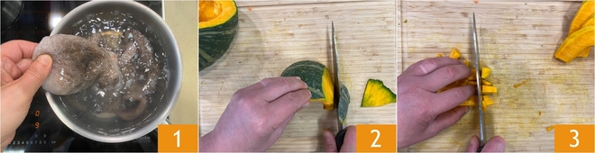 Pour préparer les pâtes avec crème de potiron et poulpe, commencez par faire bouillir une casserole d'eau et plongez le poulpe (déjà nettoyé) en le tenant par la tête, laissez-le glisser doucement dans la casserole 1. Faites cuire pendant environ 50 minutes jusqu'à ce qu'il soit tendre. Pendant ce temps, nettoyez le potiron : coupez-le en deux et retirez les filaments internes et la peau 2 ; vous obtiendrez environ 400 g de chair. Coupez la chair d'abord en tranches puis en petits cubes irréguliers, ainsi elle cuira plus rapidement 3.