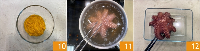 Vous devez obtenir une crème lisse et homogène 10. Pendant ce temps, le poulpe sera cuit 11, placez-le dans un bol pour qu'il tiédisse 12.