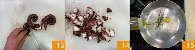 Transférez le poulpe sur une planche à découper et séparez les tentacules du corps 13. Coupez toutes les parties en morceaux d'environ 2 cm, obtenant ainsi des bouchées régulières 14. Dans une poêle, versez un filet d'huile avec de l'ail et du thym 15.