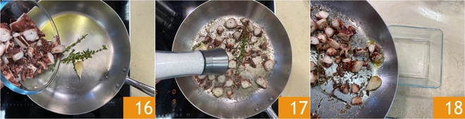 Quand ils sont chauds, ajoutez les morceaux de poulpe 16, salez 17 et laissez dorer jusqu'à ce qu'ils soient bien dorés. Une fois prêts, transférez-les dans un récipient 18 et réservez. Mettez sur le feu une casserole pleine d'eau salée et portez à ébullition.