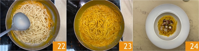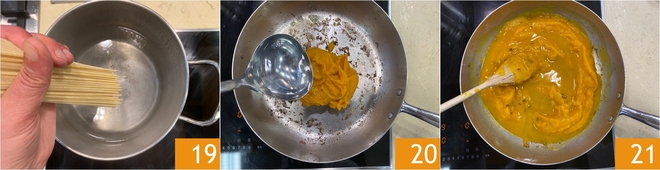 Faites cuire les spaghetti al dente ici 19. Maintenant, remettez la crème de potiron dans la poêle où vous avez fait dorer le poulpe et diluez avec une louche d'eau de cuisson des pâtes 20 21.