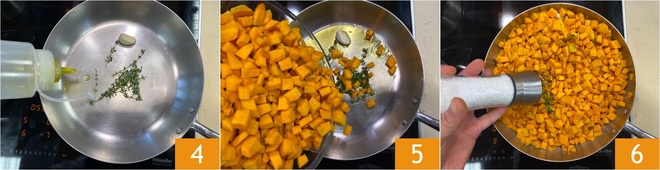 Dans une poêle, versez un filet d'huile avec une gousse d'ail et quelques branches de thym 4, laissez infuser et ajoutez le potiron 5. À ce stade, salez 6 et poivrez.