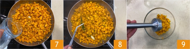 Mélangez et versez un peu d'eau chaude pour faciliter la cuisson 7. Après une dizaine de minutes, lorsque la chair est tendre, retirez l'ail et le thym 8 et transférez le potiron dans un bol. Mixez-le avec un mixeur plongeant 9.