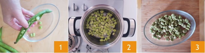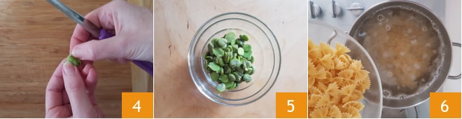 Aidez-vous d'un petit couteau pour éplucher les fèves 4 et rassemblez-les dans un autre petit bol 5. À ce stade, jetez les pâtes 6 et cuisez-les deux minutes de moins que le temps indiqué sur l'emballage.