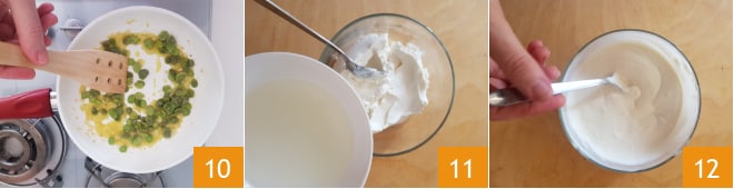 mélangez et laissez prendre goût une minute 10, éteignez le feu. À ce stade, transférez la ricotta dans un bol, ajoutez une louche d'eau de cuisson 11 et mélangez bien 12. Vous devez obtenir un mélange lisse et homogène. La quantité d'eau sera ajustée en fonction du type de ricotta.