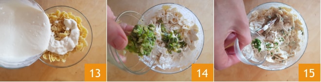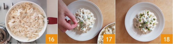Dès que les farfalle sont cuites, égouttez-les et transférez-les dans un bol. Ajoutez la crème de ricotta 13 et mélangez. Ajoutez ensuite les fèves, en en gardant quelques unes pour la décoration du plat, et mélangez à nouveau. Ajoutez aussi quelques feuilles de marjolaine 15 et mélangez.