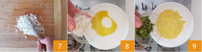 Hachez finement l'oignon 7, faites chauffer un peu d'huile dans une poêle, ajoutez l'oignon 8, salez, ajoutez un tour de moulin à poivre noir et faites légèrement dorer. Ajoutez les fèves épluchées 9,