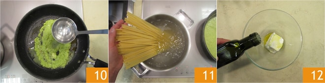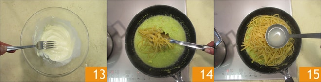 Mélangez pour amalgamer et obtenir une crème 13. Égouttez les pâtes dans la poêle avec la crème de courgettes 14. Ajoutez une louche d'eau de cuisson pour amalgamer 15 et mélangez pendant quelques minutes.