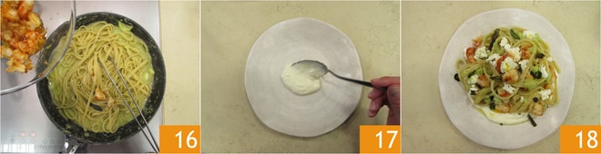 Ajoutez également les crevettes 16 et mélangez hors du feu. Versez une couche de crème de robiola dans l'assiette puis disposez dessus une portion de pâtes, garnissez avec les courgettes et le reste de robiola frais. Les pâtes à la crème de robiola avec crevettes et courgettes sont prêtes 18 !