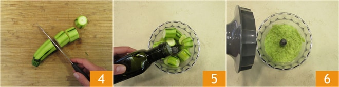 Coupez la partie restante des courgettes en petits morceaux 4, placez-les dans un mixeur et ajoutez 30 g d'huile et du sel 5, mixez jusqu'à obtenir une crème homogène 6 et mettez de côté.