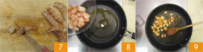 Décortiquez les crevettes et coupez-les en morceaux d'environ 2 cm 7. Faites chauffer une grande casserole d'eau et salez quand elle bout, elle servira à cuire les pâtes. Dans une poêle, versez un filet d'huile d'olive et ajoutez les crevettes 8. Faites cuire pendant 2 minutes à feu vif et salez. Éteignez le feu 9, transférez les crevettes dans un bol et mettez de côté.
