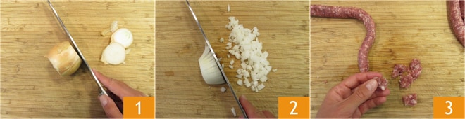 Pour préparer les pâtes à la norcina, épluchez 1 et hachez finement l'oignon 2. Incisez légèrement la saucisse, retirez le boyau et émiettez-la grossièrement avec les mains 3.