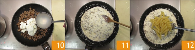 Ajoutez une louche d'eau de cuisson des pâtes 10 et mélangez 11. Égouttez les pâtes al dente directement dans la poêle avec la sauce 12 et faites sauter à feu vif pendant 2 minutes.