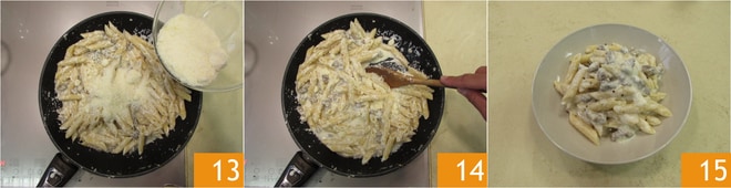 Terminez la préparation avec l'ajout du Parmesan 13, mélangez bien 14 et servez bien chaud les pâtes à la norcina 15 !