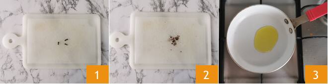 Pour réaliser les pâtes à la paolina, commencez par réduire en poudre les clous de girofle sur une planche à découper à l'aide d'un pilon 1 2 et réservez. Dans une petite casserole, chauffez un filet d'huile 3.