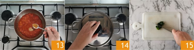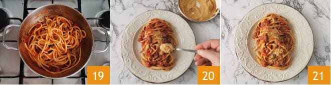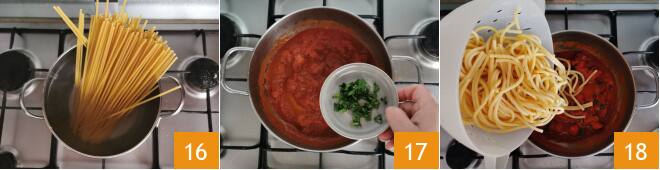 Portez à ébullition une casserole remplie d'eau salée et, lorsqu'elle bout, versez-y les spaghettis 16 et faites-les cuire al dente. Lorsque la sauce est prête, assaisonnez avec le basilic 17. Égouttez ensuite les pâtes dans la casserole avec la sauce 18.
