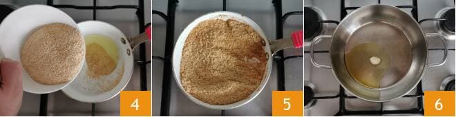 Versez la chapelure 4 et faites-la griller jusqu'à ce qu'elle soit dorée 5. Dans une autre poêle, chauffez un filet d'huile d'olive extra vierge, puis ajoutez la gousse d'ail entière 6 et faites-la dorer.