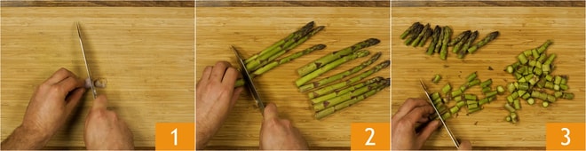 Pour préparer les pâtes à la ricotta et aux asperges, commencez par éplucher et émincer finement l'échalote. Ensuite, lavez les asperges, vous devrez simplement retirer la partie finale de la tige, c'est-à-dire la partie la plus claire et coriace 2. Continuez en tranchant les tiges pour obtenir des rondelles assez épaisses. Veuillez ne trancher que les tiges et laisser, au contraire, les pointes entières 3.