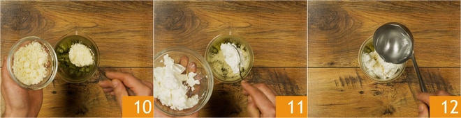 Lorsqu'elles sont tendres, transférez-les dans le bol d'un mixeur plongeant. Ajoutez également le parmesan râpé 10, la ricotta 11 et environ une louche d'eau chaude 12. Mixez le tout jusqu'à obtenir une crème homogène.