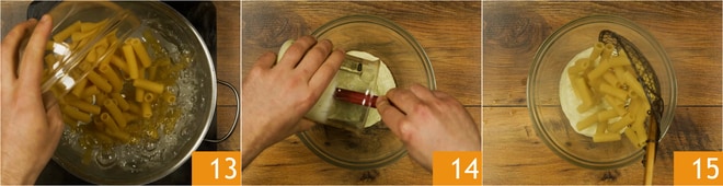 Faites cuire les pâtes dans une grande quantité d'eau bouillante, salée à votre goût 13. Transférez la crème de ricotta et d'asperges dans un grand bol 14. Si elle est trop épaisse, vous pouvez ajouter un peu d'eau de cuisson des pâtes. Égouttez les pâtes al dente et ajoutez-les dans le bol 15.