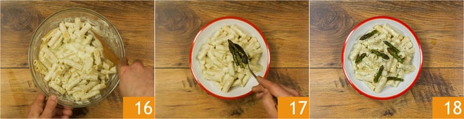 Mélangez bien pour bien assaisonner le tout 16. Il ne vous reste qu'à dresser. Transférez les pâtes dans les assiettes, ajoutez les pointes d'asperges 17, une pincée de poivre noir et servez 18.